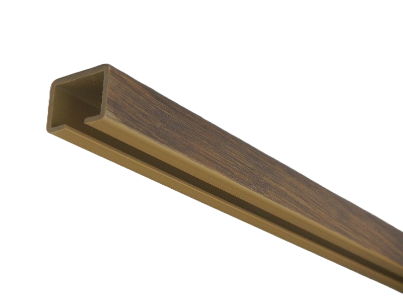 Uniwersalna prowadnica do drzwi PVC. Kolor ciemny dąb z kolekcji ST4. Szyna kompatybilna z modelami ST3, ST4, ST7, ST8, 001P, 001S. Wymiary: długość 150 cm, szer. 25mm, wys. 18mm, prześwit środkowy 7mm. Dostępna w ośmiu kolorach. Do prowadnicy dedykowane są ślizgi ok. 15 mm lub małe wózki.